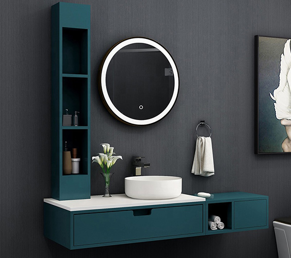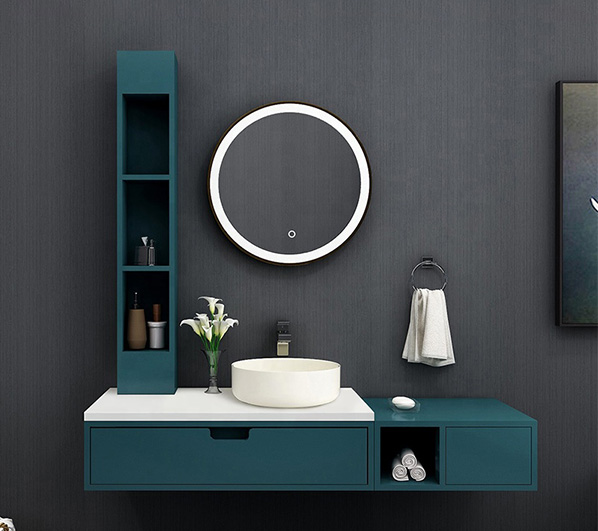 The overall suspended design with round mirror and washbasin matches the rectangular cabinet, giving your bathroom both elegance and modern style.